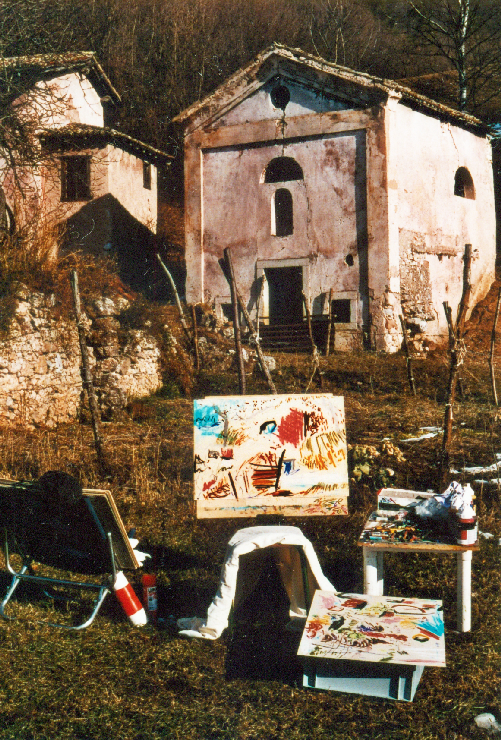 Un segno esplorante, un colore in avanscoperta: una pittura che pare tentare lontananze, ma che invariabilmente resta sacrificata alla rapidità dell'azione, alla ful-mineità del tocco. Tocco reale, di mano. Impasto generante di vasaio, "gioia maschile (per dirla con il poeta delle réveries, Ga-ston Bachelard), di palpare l'interno delle sostanze», di conoscere la materia nella sua intimità. Ma come cercare orizzonti, mettere a fuoco distanze se tutto si produce qui, nel dentro del gesto, nel chiuso dell'impronta? Come conquistare spazi senza abdicare al senso e al peso del gesto, al suo rimanere implicato, descritto dalla materia usata? Forse l'interrogazione ha la risposta in sé, perché a ben vedere lo spazio si rivela come la funzione del gesto, è legato alla sua facoltà ricognitiva. In altre parole, l'atto modellante si porta appresso lo spazio dove appoggiarsi e dove deporre la propria corsiva traiettoria.